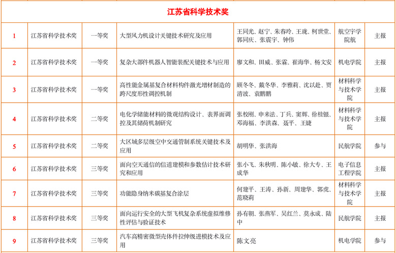 2018年我校获得江苏省科学技术奖9项(一等奖3项,二等奖2项,三等奖4项),主报项目获奖数量位江苏高校第三位。一院王同光教授团队的“大型风力机设计关键技术研究及应用”、五院廖文和教授团队的“复杂大部件机器人智能装配关键技术与应用”以及六院顾冬冬教授团队的“高性能金属基复合材料构件激光增材制造的跨尺度形性调控机制”获江苏省科学技术一等奖。学校获一等奖3项是历年来获奖数最多的一年。