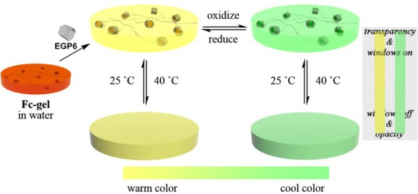 基于上述思考,该研究首次基于不同功能的正交一体化策略,将乙二醇修饰的柱[6]芳烃(EGP6)的热响应性(温致变色效应)与氧化还原诱导的二茂铁/二茂铁鎓离子基团之间暖色与冷色之间可逆转换(色调转换效应)的性质正交一体化于一个功能体系中,成功制备了冷/暖色调可转换的温致变色材料。基于EGP6与二茂铁的主-客体作用,他们将二茂铁侧链修饰的聚丙烯酰胺聚合物凝胶(Fc-gel)浸泡在EGP6水溶液中,得到了显著溶胀且高度透明的水凝胶(Fc-gel∙EGP6)。该水凝胶中,因二茂铁基团在氧化还原刺激下能够在橘色和绿色之间可逆转换,由此制备的智能窗材料便具有冷/暖色调转换的功能。更重要的是,这种透明的Fc-gel∙EGP6水凝胶不管是在暖色调还是在冷色调下都继承了EGP6优异的温度响应性能,使其成为一种优良的温致变色材料,可以调节太阳辐射能量的透过率,营造更加舒适的室内环境。这种冷/暖色调可转换的温致变色智能窗材料成功地为不同性质的正交一体化策略提供了应用实例,同时该策略也为新型功能化材料的开发提供了新方法。