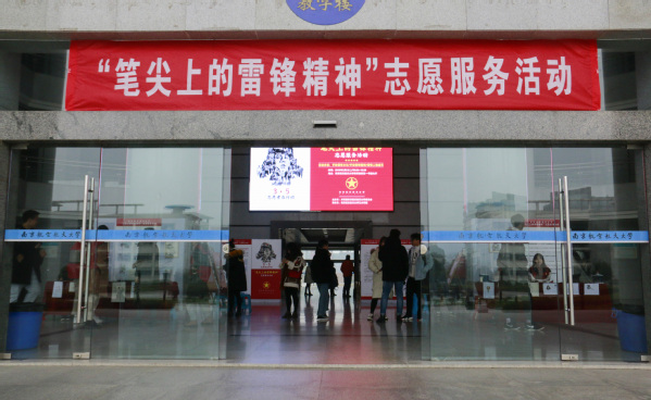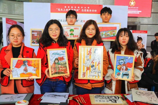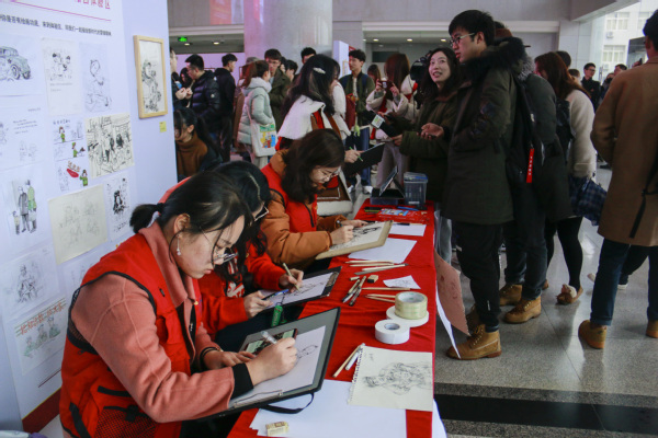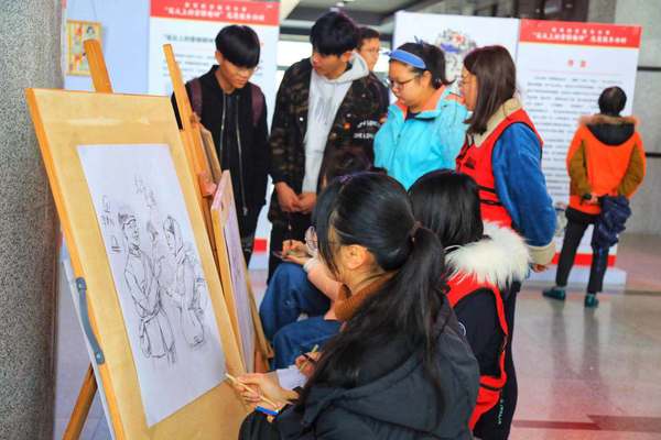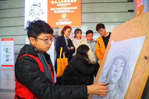 3月5日,由校团委主办、艺术学院承办的“笔尖上的雷锋精神”志愿服务活动在将军路校区一号楼大厅举办。身穿红马甲的志愿者坐在画板前,用手中的画笔勾勒出雷锋形象,用笔尖传递雷锋精神。