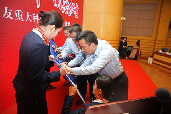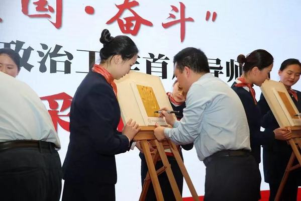 随后进行了思想政治工作首席导师团的受聘仪式。C919飞机机体集成IPT团队—全机强度综合验证IPT团队受聘为“爱国·奋斗”南航思想政治工作首席导师团,杭育新为团队颁发聘书。