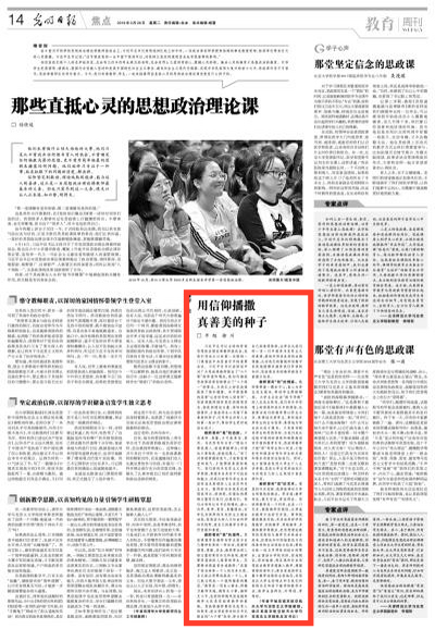 3月26日,《光明日报》刊登我校马克思主义学院教授平旭、学院党总支书记徐川的文章《用信仰播撒真善美的种子》,现转发全文。