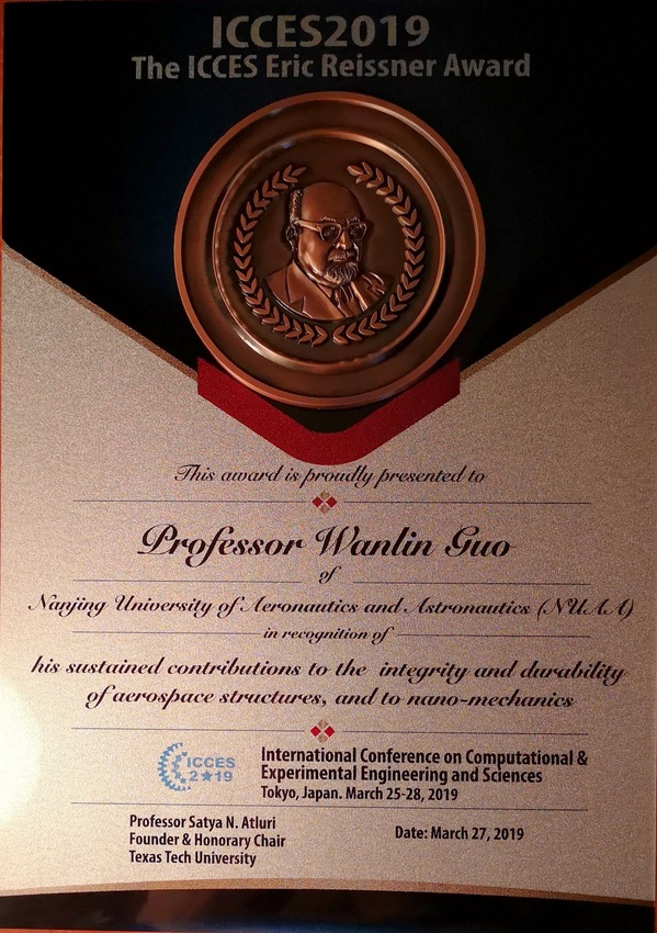 会议期间,郭万林院士获颁Eric Reissner Award,用以表彰他“对航空航天结构的完整性和耐久性以及纳米力学的持续贡献”。该奖项以美国工程院院士、美国艺术与科学院院士、数学力学家Eric Reissner 教授名字命名,以此鼓励在力学研究方面做出杰出贡献的学者。郭万林院士是国际上第七位获此殊荣的学者。