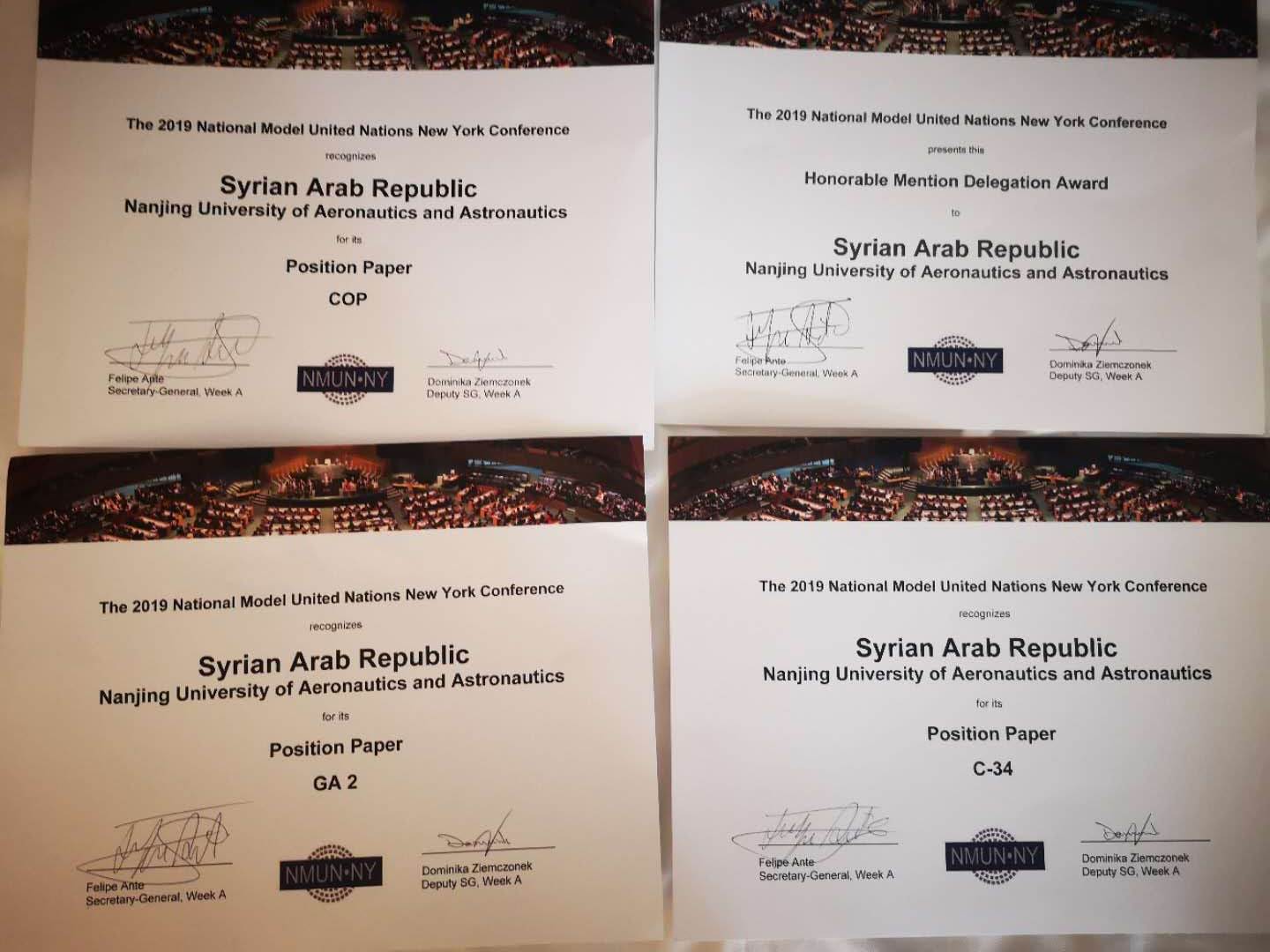 在近日举行的2019纽约全美模拟联合国大会上,我校代表团荣获大会“优秀代表团”(Honorable Delegation)团体三等奖,“最佳立场文件”(Outstanding Position Paper)个人一等奖三项,成绩居于非母语国家高校前列、国内高校第一方阵。