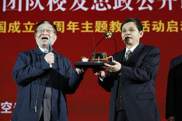 叶培建院士代表“嫦娥四号”研制团队向南航赠送“玉兔二号”模型,校长聂宏代表学校接受模型。活动在现场全体师生同唱《歌唱祖国》歌声中落下帷幕。