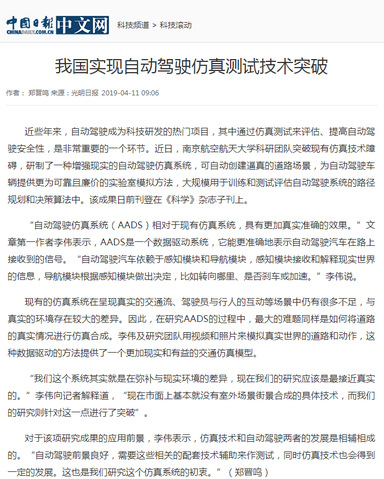 中国日报网:我国实现自动驾驶仿真测试技术突破