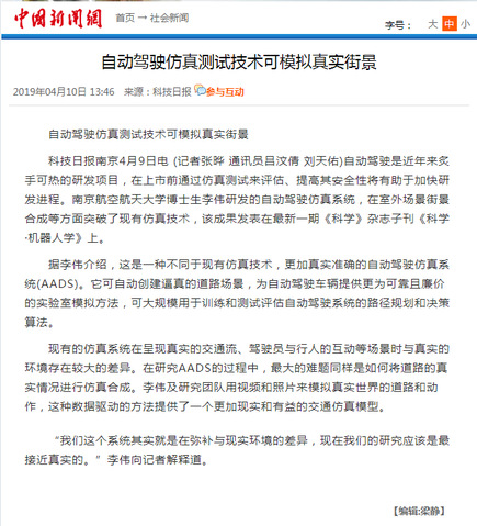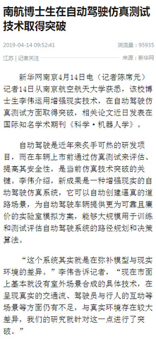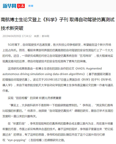 新华网:南航博士生论文登上《科学》子刊 取得自动驾驶仿真测试技术新突破