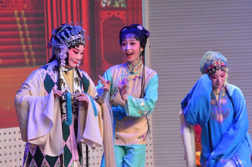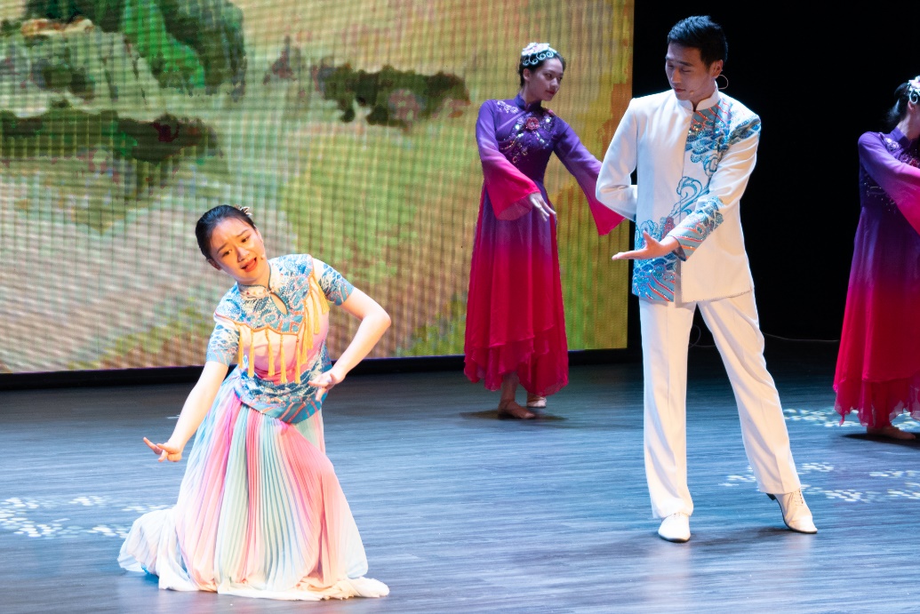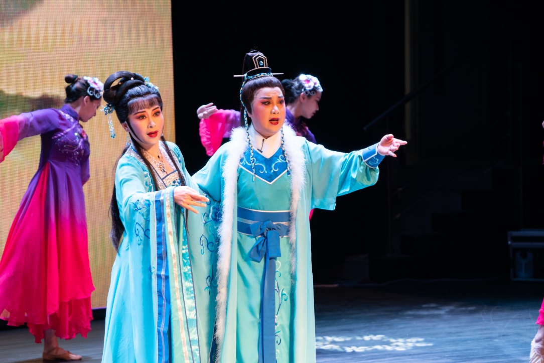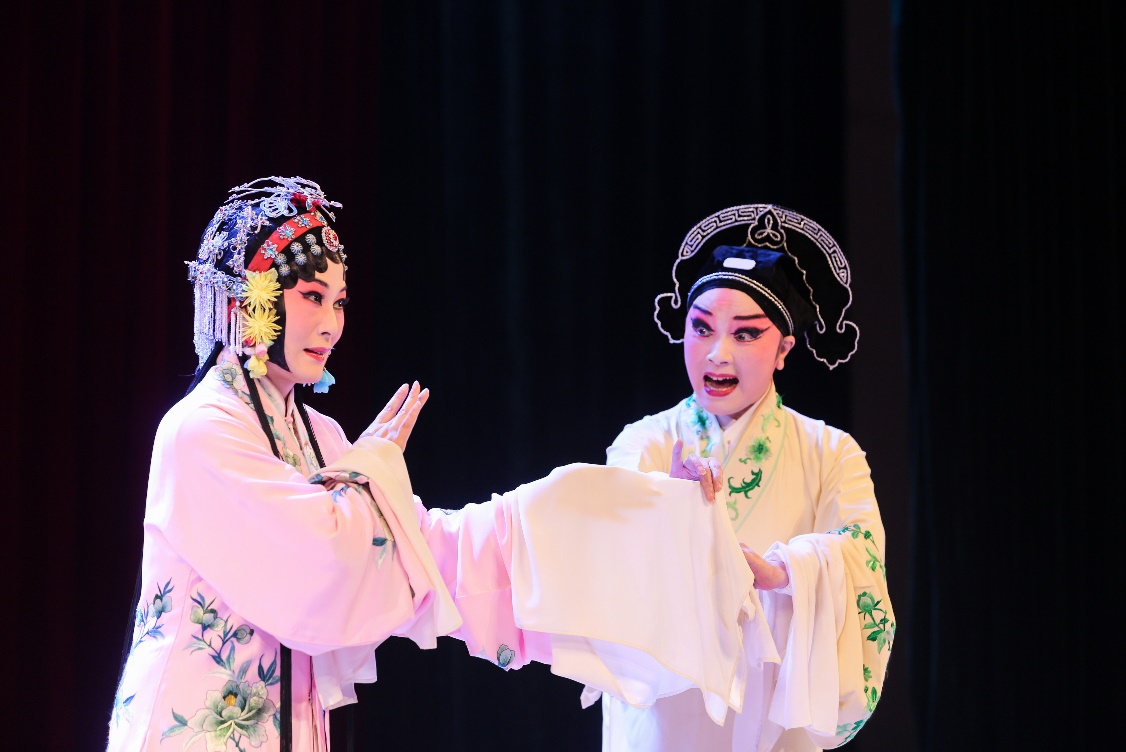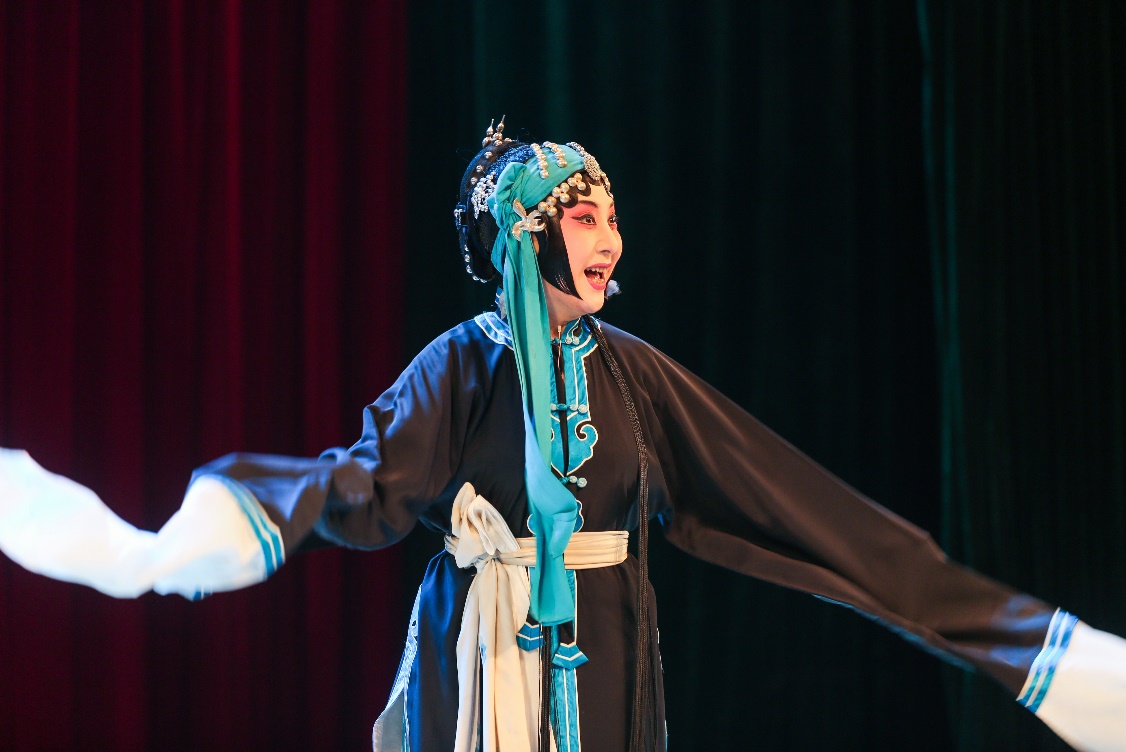 本场演出的戏曲名家中有5位戏剧梅花奖获得者,5位戏曲国家级传承人。“赴秋闱,下第归,中心惆怅,叹仕途,难容我,落拓疏狂。”演出在国家一级演员、竺派传承人竺小招和戏曲梅花奖、白玉兰奖获得者、国家一级演员陶琪表演的《柳毅传书•湖滨惜别》中拉开序幕;之后国家一级演员、戏曲梅花奖获得者徐秀芳老师演绎扬剧《鸿雁传书》,国家一级演员、戏曲梅花奖获得者倪同芳领衔锡剧《玉蜻蜓•探病得子》;昆剧泰斗石小梅、国家一级演员、戏曲梅花奖获得者孔爱萍带来的昆剧《牡丹亭•惊梦》更是将演出推向高潮,现场不时爆发出雷鸣般的掌声。最终师生共同演唱的《越韵古诗•无题》,由我校经济与管理学院与人文与社会科学学院的两位同学演绎前半段,竺小招老师和陶琪老师演绎后半段。