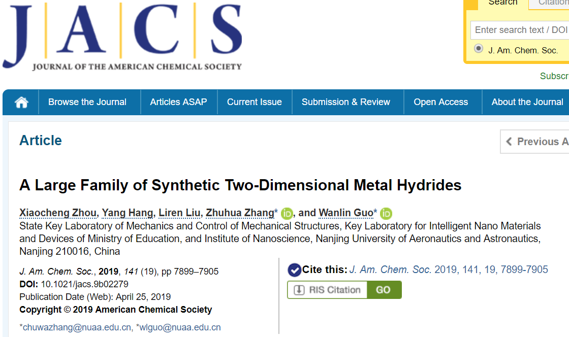 最近,美国化学学会会刊Journal ofthe American Chemical Society (JACS)在线发表了我校纳米科学研究所团队关于二维金属氢化物的最新研究成果。博士生周晓成与杭阳是论文的共同第一作者,张助华教授和郭万林院士为通讯作者,共同作者还包括刘立仁博士。JACS由美国化学会创办于1879年,至今拥有130多年历史,是材料与化学类领域最权威的综合性期刊之一。谷歌学术将所有学科分为八大领域,JACS位列材料与化学大领域第一。