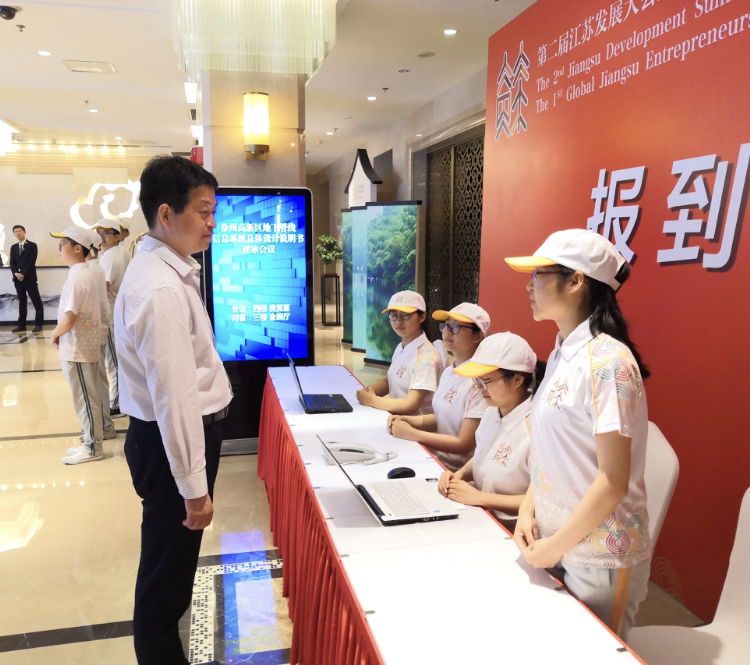 5月20日上午,第二届江苏发展大会暨首届全球苏商大会在南京成功召开,大会以“聚力新江苏,奋进新时代”为主题,江苏省委书记娄勤俭作主旨演讲,省委副书记、省长吴政隆主持。我校来自6个学院的44名志愿者在本次活动中负责金峰汇大酒店200余名嘉宾的接待服务工作。校长聂宏在会议期间看望慰问了我校志愿者。江苏团省委副书记林小异在江苏发展大会开始前也亲临现场视察了我校志愿者演练的接待工作流程,并给予充分肯定。