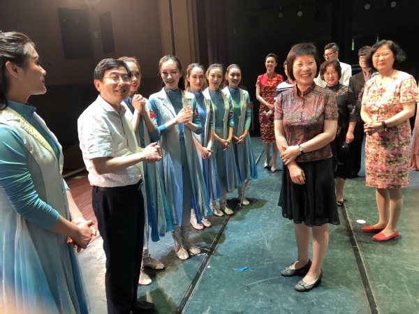 开班仪式之前,万丽君在副校长施大宁的陪同下,赴将军路校区观看了我校优秀传统文化师生作品展与我校大学生艺术团的汇报演出,并就我校公共艺术教育开展情况与师生们进行了交流。