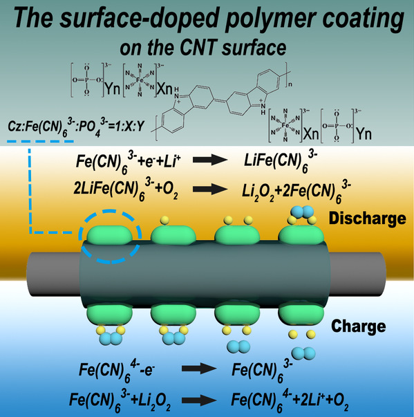 最终,课题组通过将碳纳米管薄膜作为基底,通过电化学聚合的方法让咔唑单体沿着碳管纤维进行聚合生长,并首次采用恒电压掺杂去掺杂方法,制备出铁氰酸根和磷酸根离子共掺杂的碳纳米管聚咔唑复合物(CNT/PCz:FCN)。将这种材料作为锂氧电池的自支撑电极,充电电压降低到3.6V,在150圈充放电循环后,大部分充电电压保持在4.0V以下,实现了目前有机催化剂电极在锂氧电池中的最佳电化学性能。