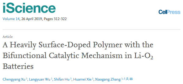 近日,我校材料科学与技术学院张校刚教授课题组(以下简称“课题组”)在锂氧电池有机催化剂方面取得重要研究进展。相关研究成果《A Heavily Surface-Doped Polymer with theBifunctional Catalytic Mechanism in Li-O2 Batteries》以我校为第一单位发表在《Cell》子刊《iScience》,第一作者是我校材料科学与技术学院的博士研究生徐呈旸。