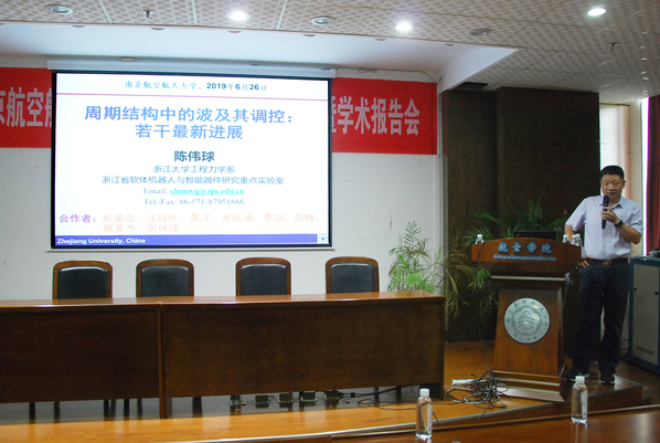 聘任仪式结束后,陈伟球教授作题为“周期结构中的波及其调控:若干最新进展”的报告,介绍了软材料周期结构的变形及其对波的调控、基于梯度材料的线性声学二极管的设计及拓扑声波及其调控等内容。上述研究揭示了若干重要的波动现象,对可调声学器件的设计具有一定的指导作用。报告结束之后,他针对师生们提出的具体问题,进行了深入交流。