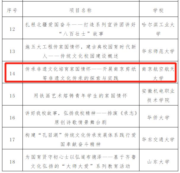 近日,由教育部主办的第五届全国高校“礼敬中华优秀传统文化”示范项目、特色展示项目遴选中,由我校申报的《传承非遗文化,培育家国情怀——开展南京剪纸等非遗文化传承的探索与实践》项目被评选为“礼敬中华优秀传统文化”特色展示项目。