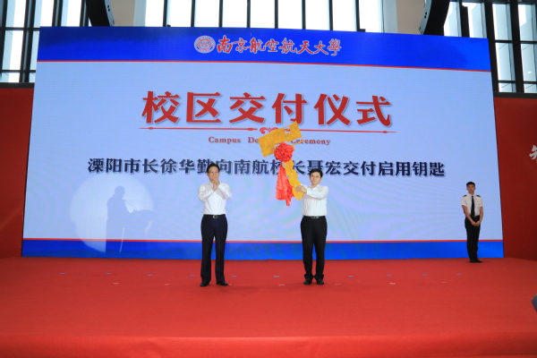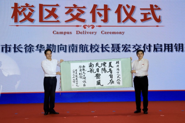 仪式上,溧阳市长徐华勤向我校校长聂宏交付校区启用钥匙。聂宏校长代表学校向溧阳市赠送了我校教师自主创作的“美音自在溧阳,天目御风南航”书法作品。
