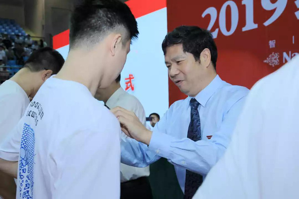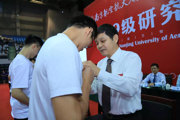 典礼在雄壮的国歌声中开始,全体校领导为2019级研究生新生代表佩戴南航校徽。校徽承载着学校对同学们的美好祝福与殷切期望,从戴上校徽的那一刻起,就真正成为了一名南航研究生。