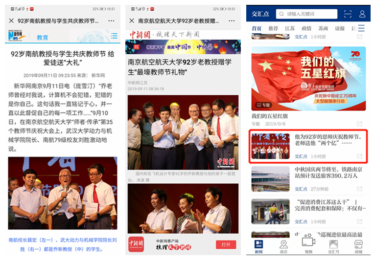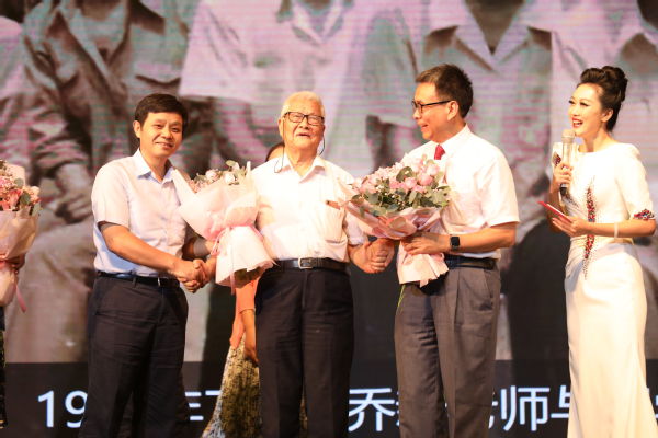 发言结束之后,聂宏校长、刘胜校友与校内外同门齐聚一堂,重逢恩师,为92岁的乔新老师献上了教师节的祝福。乔新老师为刘胜校友精心准备一份特殊的礼物,并向全体南航人送上“自强不息”的寄语,爱生爱校之心,令人动容,全场师生为乔新老师献上了最热烈的掌声。