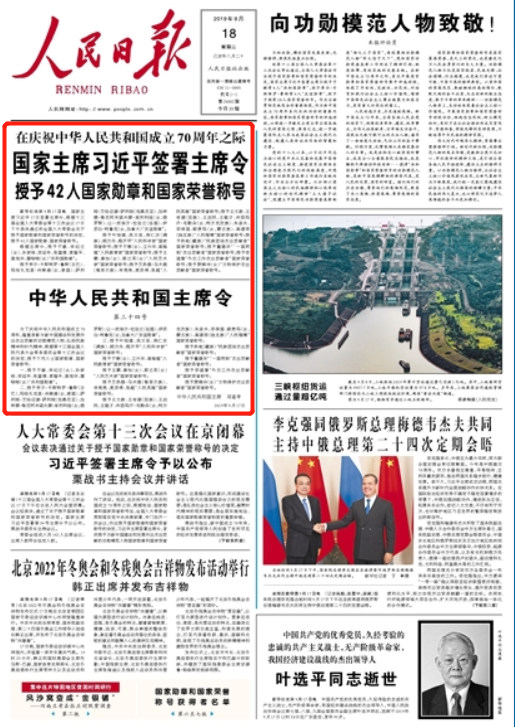 9月17日,国家主席习近平签署主席令,根据十三届全国人大常委会第十三次会议17日下午表决通过的全国人大常委会关于授予国家勋章和国家荣誉称号的决定,授予42人国家勋章、国家荣誉称号。中国空间技术研究院研究员、我校航天学院院长叶培建院士获得“人民科学家”国家荣誉称号。