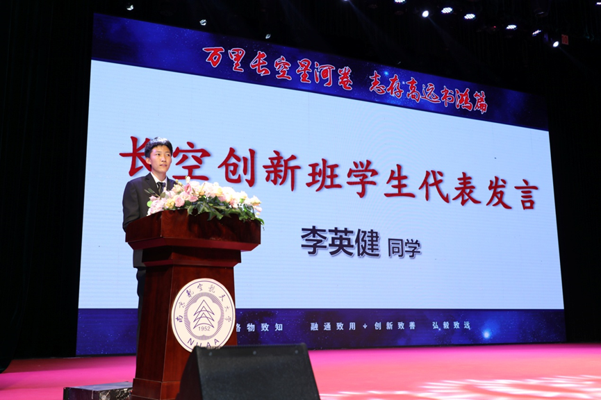 在开展航空航天大类培养改革的同时,长空学院也扎实推进拔尖创新人才培养模式改革,“长空创新班”由此应运而生。826名学生申请,历时两月,多轮选拔,无数个“长空十二时辰”,60名南航新生以优秀的综合素质成功入选,成为首届“长空创新班”学生。李英健同学代表长空创新班首届学生发表感言。