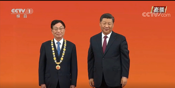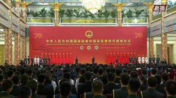 70周年国庆前夕,29日上午,中华人民共和国国家勋章和国家荣誉称号颁授仪式在人民大会堂隆重举行。中共中央总书记、国家主席、中央军委主席习近平向国家勋章和国家荣誉称号获得者分别授予“共和国勋章”“友谊勋章”和国家荣誉称号奖章并发表重要讲话。