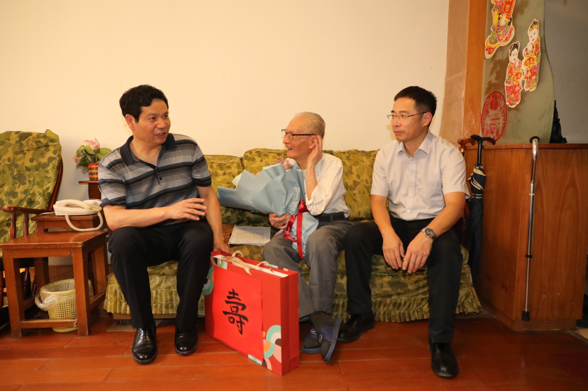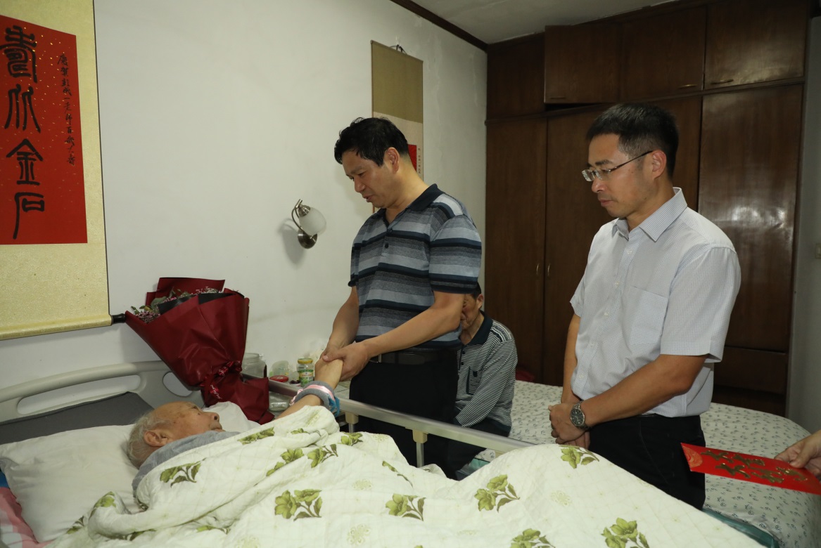 随后,郑永安来到退休老教授、101岁高龄的彭成一老先生家中。彭老先生1942年毕业于西南联合大学航空工程系,曾任南航动力工程系教授、博士生导师、动力工程系主任。他是我国著名航空发动机专家,长期致力于发动机气体力学的教学与研究工作,1990年2月退休。1992年被航空航天部授予“有突出贡献的专家”称号。在彭老的床前,郑永安书记送上鲜花和慰问品,并致以节日祝福。面对老先生的状况,郑永安叮嘱彭老的家人,要精心照料好老人,祝愿老人病情早日好转。