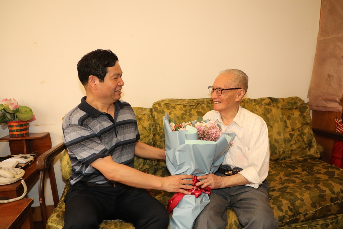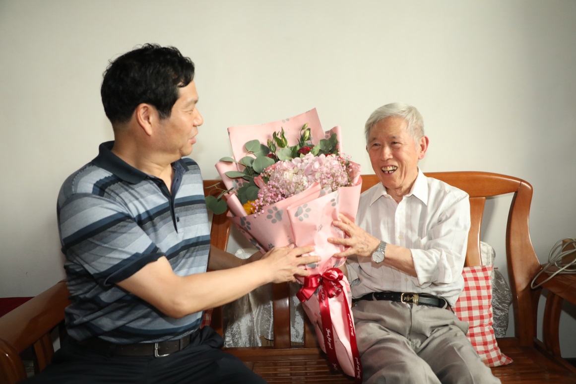 郑永安走进蒋老家中,向他送上鲜花和慰问品,并致以节日的祝福。郑永安与蒋老促膝而坐,亲切交谈,蒋老身体硬朗、精神矍铄,在谈到蒋老在学校举行的“庆祝中华人民共和国纪念章”颁发仪式上的发言时,郑永安再次表达了对蒋老的敬意和赞誉,并希望蒋老好好保重身体安享晚年。