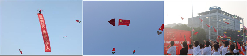 伴随着高亢悠扬的校歌,航模飞机缓缓升起,“敬礼祖国 建功时代”和“奔跑新时代 勇做追梦人”的条幅在国旗下逐渐展开,七架航模飞机围绕国旗在蓝天下翱翔,现场师生共同向着蓝天和远方放飞纸飞机,承载着南航人“志存高远望千里,鹰击长空会有时”的精神追求,共同为新中国成立70周年献礼!