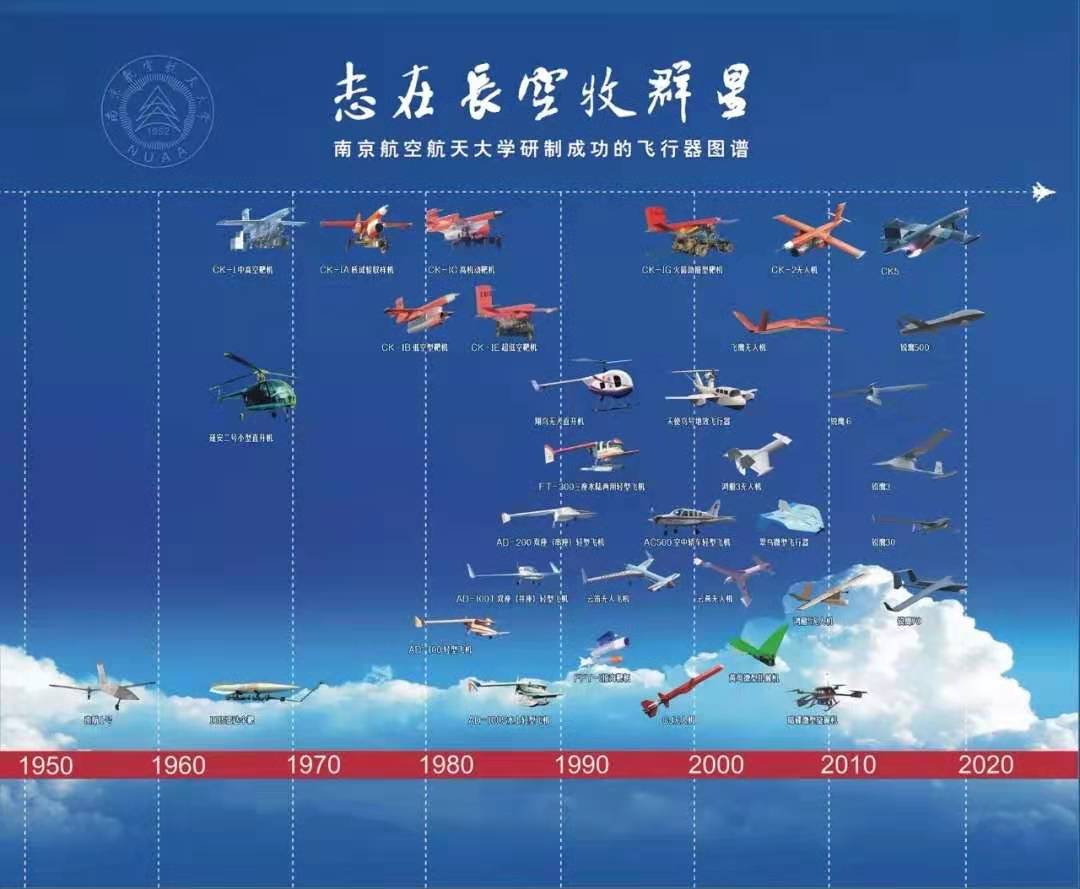 一代又一代南航人栉风沐雨、砥砺奋进,历经多个重要型号的打磨,为共和国研制了数个第一:第一架自主研制的具有完全知识产权的直升机——延安二号,第一架无人驾驶核试验取样机——CK-1A 核试验取样机,第一架无人驾驶大型靶机——CK-1 中高空靶机,第一架无人驾驶直升机——翔鸟无人直升机,第一架微型飞行器——翠鸟微型飞行器,第一颗用于目标特性测试的微小卫星——天巡一号。
