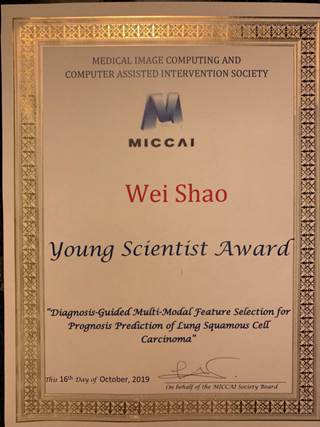 在10月17日结束的2019年第22届医学图像计算和计算机辅助干预国际会议(The 22th Medical Image Computing Computer Assisted Intervention,MICCAI 2019)上,我校计算机科学技术学院/人工智能学院博士后邵伟在MICCAI正会上展示了他在联合基因影像数据进行预后预测上的研究工作,并凭借论文《Diagnosis-Guided Multi-modal Feature Selection for Prognosis Prediction of Lung Squamous Cell Carcinoma》一举斩获大会青年科学家奖(Young Scientist Award)。成为本次会议5位获奖者中唯一国内的青年科学家,其他四名获奖者分别来自美国约翰霍普金斯大学,美国梅奥诊所,法国巴黎综合理工大学等全球排名前50的科研或医疗机构。
