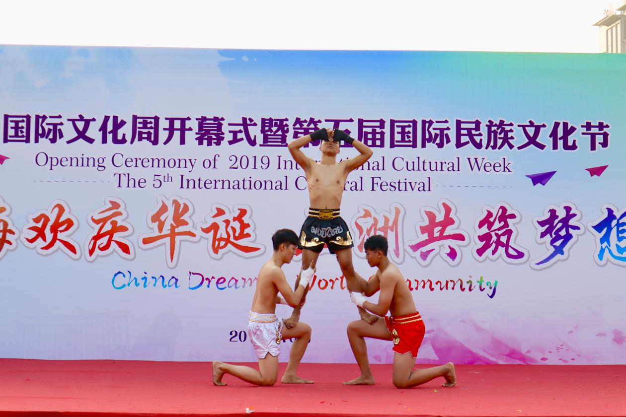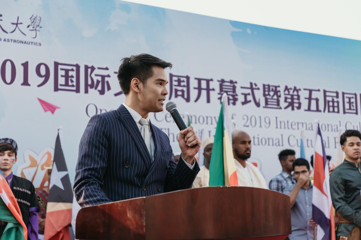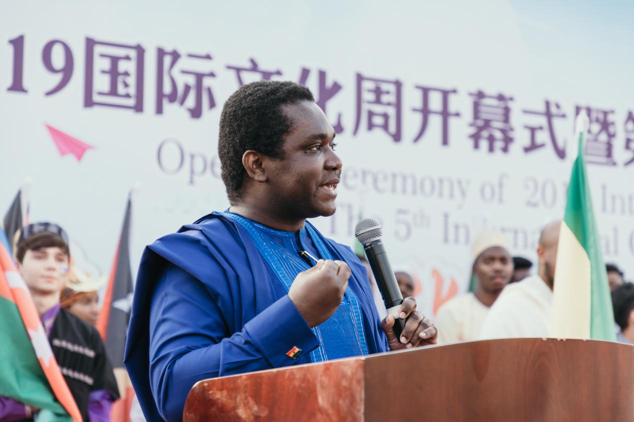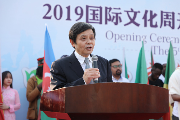 在独具各国风格的入场式后,校长聂宏、加纳共和国驻华副大使Charles Dwamena、津巴布韦驻华副大使Dube Mqabuko Spencer、埃塞俄比亚驻上海总领事Workalemahu Desta、泰国驻上海总领事馆教育领事Wesarat Keokajee分别致辞,并推动启动杆,启动了“2019国际文化周”。