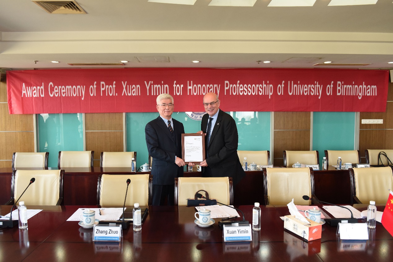 授予仪式中,David Eastwood校长高度评价了宣益民院士的学术成就,充分肯定了其与伯明翰大学科研团队的密切合作。他表示,希望宣益民院士及其团队能够继续加强与伯大的科研合作、学术交流等,为两校带来更多的合作成果。随后,David Eastwood校长为宣益民院士授予了伯明翰大学荣誉教授证书,这为两校进一步合作掀开了新篇章。
