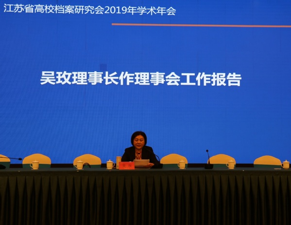吴玫代表江苏省高校档案研究会第十届理事会作了2019年工作报告,报告对2019年研究会主要工作、全省高校档案工作特色与亮点及明年研究会工作思路进行了总结和概括。