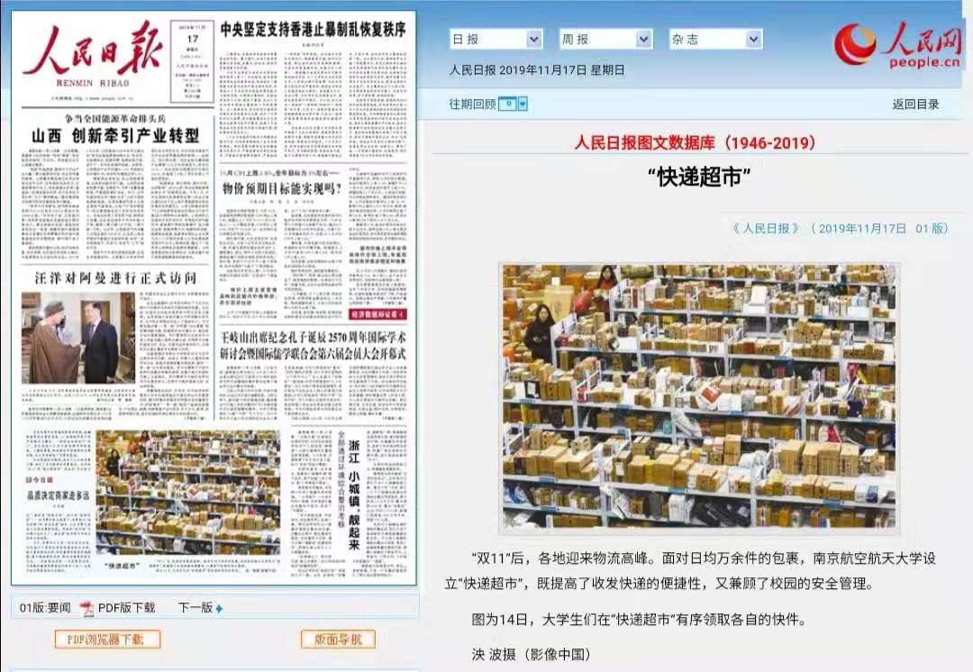 11月17日,《人民日报》头版图片报道我校“快递超市”。报道称,“双11”后,各地迎来物流高峰。面对日均万余件的包裹,南京航空航天大学设立“快递超市”,既提高了收发快递的便捷性,又兼顾了校园的安全管理。