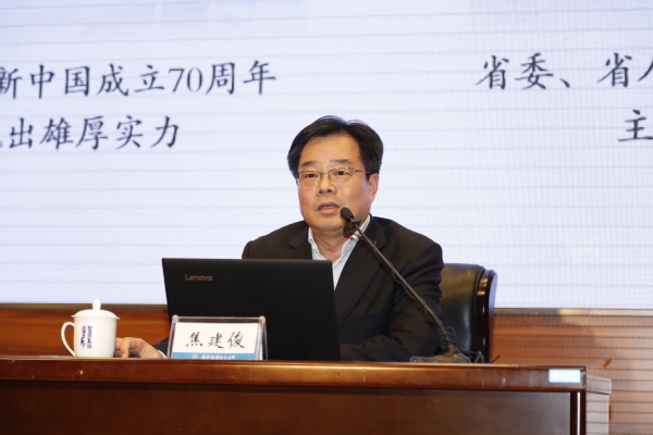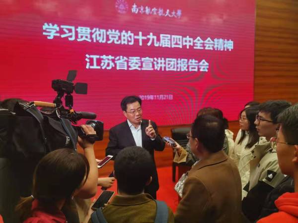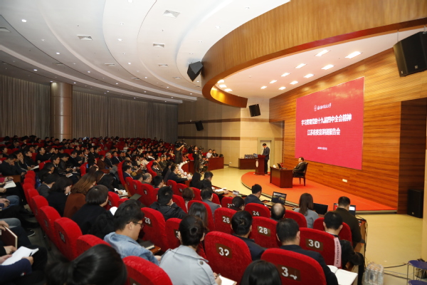 11月21日下午,我校在将军路校区1号楼4楼报告厅举行学习贯彻党的十九届四中全会精神江苏省委宣讲团报告会。江苏省委宣讲团成员、中共江苏省委委员、江苏省委宣传部常务副部长焦建俊作报告。我校党委书记郑永安主持报告会。