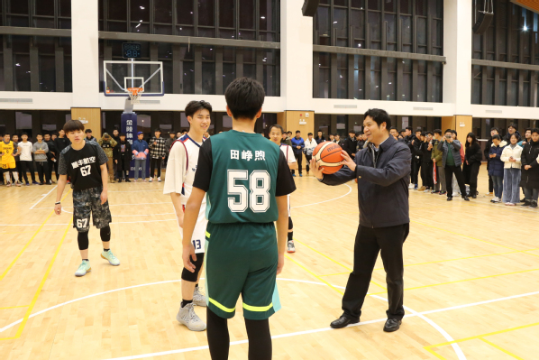 晚上,郑永安一行来到风雨操场,为天目湖校区首届班级篮球联赛开球,并观看了比赛。