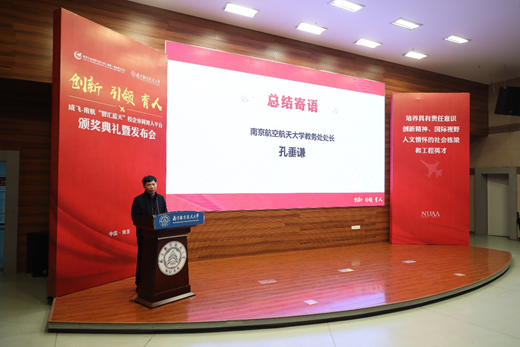 活动最后,孔垂谦进行总结发言。他对受到表彰的老师和同学表示祝贺,对参与、支持“智汇蓝天”校企协同育人平台的航空工业成飞和学校各单位、师生表示感谢。他表示,今后学校将全力推进本科人才培养模式的改革,与航空工业成飞协同合作,共同为我国航空航天事业培养高素质创新性人才,为我国航空航天事业贡献力量。