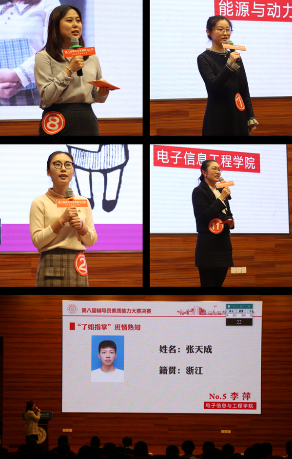 决赛包括“初识导员”个人展示、“了如指掌”班情熟知、“掷地有声”理论宣讲和“春风化雨”谈心谈话四个环节。在个人展示和班情熟知环节中,参赛选手以贴近学生的自我介绍和扎实牢靠的基础工作赢得了在场师生的好评。