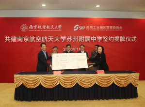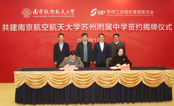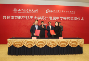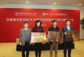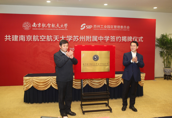 会上,聂宏和吴庆文共同为南京航空航天大学苏州附属中学隆重揭牌。施大宁与夏芳代表双方签署联合建设“南京航空航天大学苏州附属中学”协议。施大宁代表学校向星海实验中学、西安交通大学苏州附属中学、苏州大学附属中学授予“南航优秀生源基地”铜牌。刘宇雷与夏芳代表双方签署“苏州工业园区”奖学金协议。南航苏州校友会副会长王奇峰、南航苏州附属中学校长王剑共同为南航苏州校友活动基地揭牌。