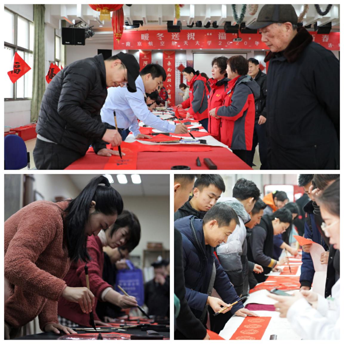 1月14日,由党委宣传部、校工会、离退休处、艺术学院联合主办的“暖冬送祝‘福’,墨香迎新春”——南京航空航天大学2020年“迎春送福”活动分别在我校明故宫校区、将军路校区、天目湖校区三个校区同时举行。党委常委、组织部部长李遥,党委常委、宣传部部长王晖出席活动,相关部处领导、师生员工、离退休老同志等700余人参加活动。