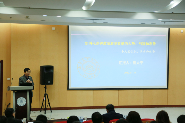 研讨会上,施大宁做了题为“新时代高等教育教学改革的大势、形势和态势”的专题报告。施大宁回顾了全国高校思想政治工作会议、全国教育大会等重要会议中对高等教育的论述,分析了高等教育的新形势,阐述了专业建设方面的新工科理念及其目标、过程和现状,重温了教育思想大讨论总结的十大计划,分享了他对金课、慕课、课程思政的认识。“以学生为中心,融合信息技术,打造新型教育生态圈”、“打破边界是手段,师资队伍是关键,体制机制是保障”等观点引起与会人员的强烈共鸣。