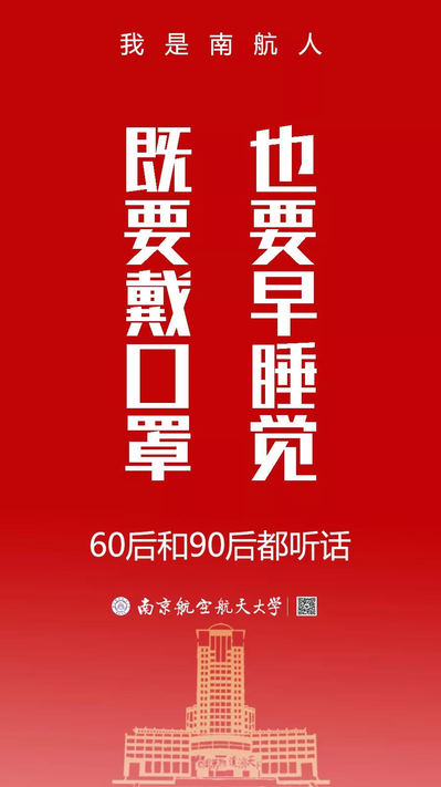 万众一心,没有翻不过的山;心手相牵,没有跨不过的坎。同学们,让我们行动起来,坚定信心、齐心协力,同舟共济、守望相助,为打赢这场疫情防控战展现新时代南航青年的担当!