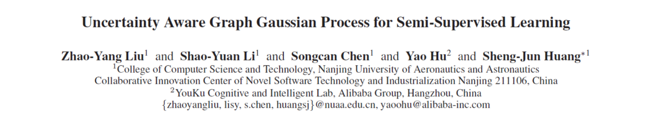 论文《Uncertainty Aware Graph Gaussian Process for Semi-Supervised Learning》为与阿里巴巴视频推荐团队合作完成。这也是双方继在优酷视频推荐实际任务中取得显著进展后,再次合作发表顶级会议论文。该工作主要面向标记数据不足的图网络数据提出了一种新的半监督学习方法。在很多现实任务中,数据以图网络的形式存在,在基于图的半监督学习中仅有部分节点有标记,需要依靠图的已标记节点构建模型预测其余未标记节点的标记。利用图的结构关系可以辅助模型学习更多的数据信息。该工作基于稀疏变分高斯过程提出了从特征聚合和光滑性假设两方面来利用节点关系:一方面特征聚合即基于图网络传播节点特征,同时聚合节点原始输入特征和高斯过程推断变量;另一方面对于聚合后所得概率变量施加对称马氏距离约束。实验结果显示提出的方法能够有效利用未标记数据提升模型性能。