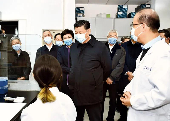 2020年3月2日,中共中央总书记、国家主席、中央军委主席习近平在北京考察新冠肺炎防控科研攻关工作。这是习近平在军事医学研究院重大疫情应急防控药物研究室了解疫苗和抗体研制情况。