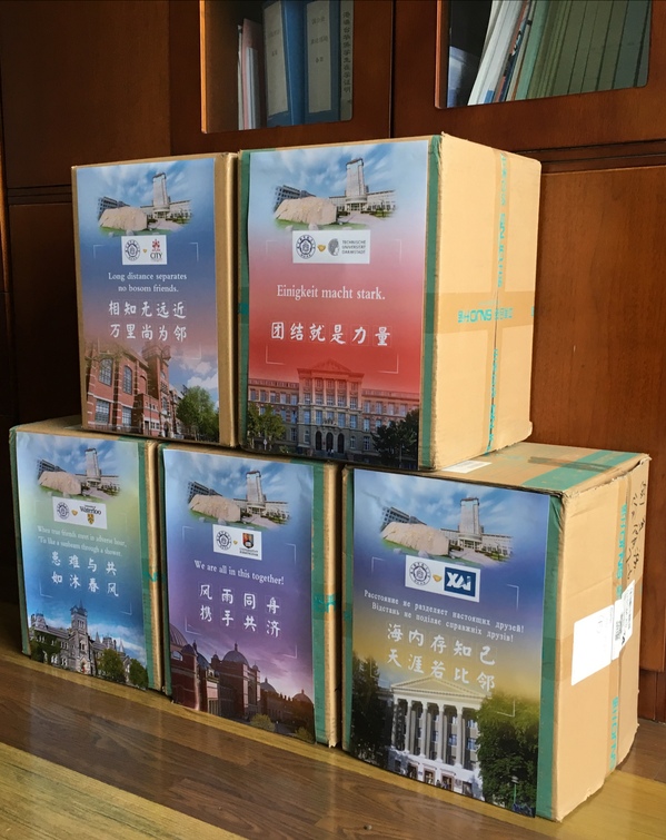“海内存知己,天涯若比邻”及其德文“Ein Vertrauterim Meer, ein Nachbar auf der Welt.”被印在驰援德国锡根大学的物资包装箱上,表达两校虽然相隔万里,但我们携手同行之心紧相连。当满载深情厚谊的物资包裹寄出之后,南航也先后陆续收到了合作伙伴们暖心的致谢。