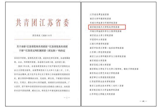 近日,共青团江苏省委发布《关于表彰“江苏省优秀共青团员”“江苏省优秀共青团干部”“江苏省五四红旗团委(团支部)的决定”》,我校多个集体和个人获表彰。其中,机电学院团委荣获“江苏省五四红旗团委”,能源与动力学院驭风排气系统纵向团支部荣获“江苏省五四红旗团支部”,人文与社会科学学院1016101团支部的团支书梅旭鹏荣获“江苏省优秀团支部书记”,民航/飞行学院16级本科生丁文浩、艺术学院17级本科生顾婉菁荣获“江苏省优秀共青团员”,校团委副书记董羽荣获“江苏省优秀共青团干部”。我校团委在每一个集体和个人奖项上均有斩获。