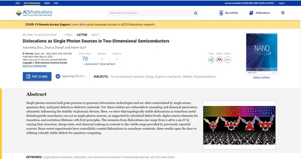最近,国际著名期刊《纳米快报》(Nano Letters)在线报道了我校纳米科学研究所团队关于二维材料新型单光子发射源的研究进展。