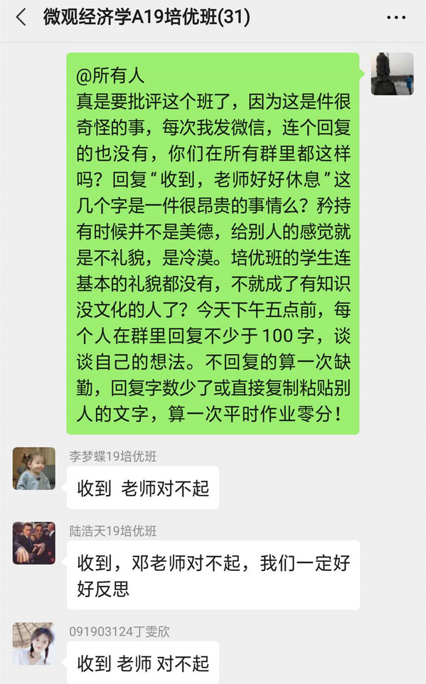 爱之深,责之切。要说到经济与管理学院批评学生最多的教师,可能还是邓老师。有些学生列出了邓老师的种种“恶行”:上课时因迟到或是没有回答出来问题被罚站;因为不按要求提交作业或修改被罚手写不少于2000字的检讨;因为习惯性地不回复老师微信,全班被狠狠批评,并要求全班同学写反思;批评一些同学不认真听他人汇报,不尊重同学劳动,要求这些同学在课程微信群里公开道歉……