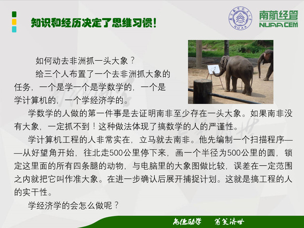 即使是毕业多年的学生,对邓老师的课堂内容和教学环节还是记忆犹新:通过讨论如何去非洲抓一头大象来理解什么是经济学思维;通过分析大学生恋爱行为来理解各种成本的概念;邓老师甚至通过“教”学生如何“理性地旷课”来深入说明“个人理性并非集体理性”…… 。