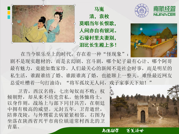 同学们戏称邓老师是南航“段子手”,轻松愉快是邓老师课堂的重要标签。其实,标签背后凝结的是邓老师对经济学课程的深刻理解与文化重塑。浏览邓老师的部分课件,既有经济学特征,也融合了中国古代诗词、世界史等多种素材。邓老师巧妙地将历史、典故等与经济学原理融合,在讲授知识的同时,弘扬中外优秀文化,增强学生文化自信。