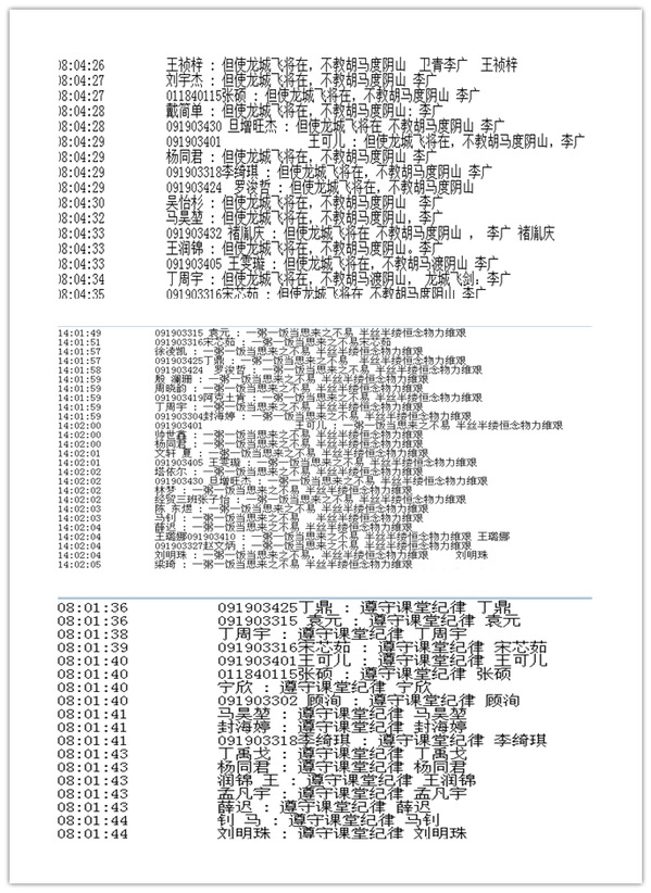 邓老师的线上课程从签到开始,“不要迟到”“遵守课堂纪律”的“提醒式口令”、“一粥一饭,当思来处不易,半丝半缕,恒念物力为艰”的“家训式口令”、“但使龙城飞将在,不教胡马度阴山”的“诗词式口令”等邓氏花式签到法,让同学们不仅“屏”前一亮,更在开课前播下了思考的种子。